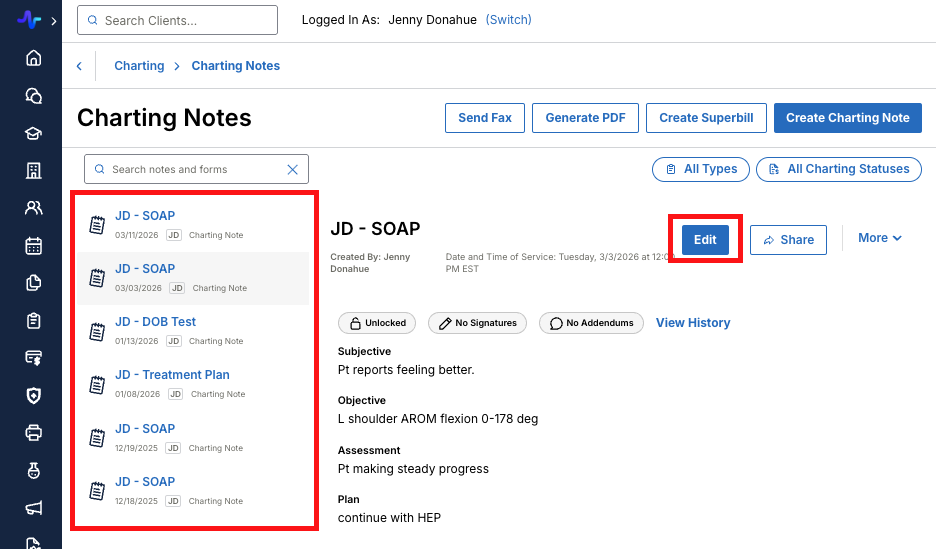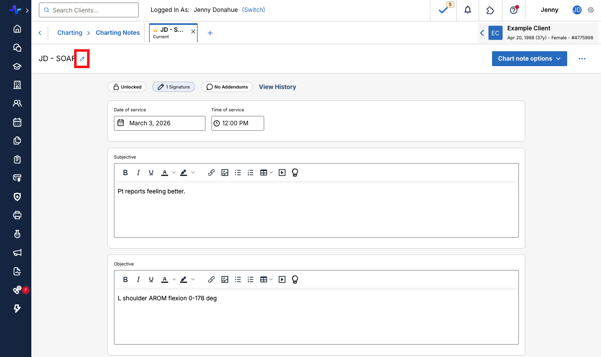 Note: if a chart note has been locked, it first needs to be unlocked before further edits can be made. If a chart note has been signed, the signature needs to be removed before further edits can be made. Learn more here.
