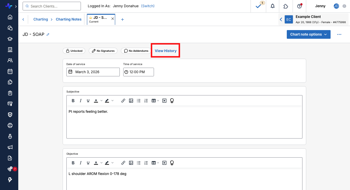 Healthie maintains a full audit trail of updates and edits made to chart notes, that are also timestamped. To view this audit trail, click View History.
