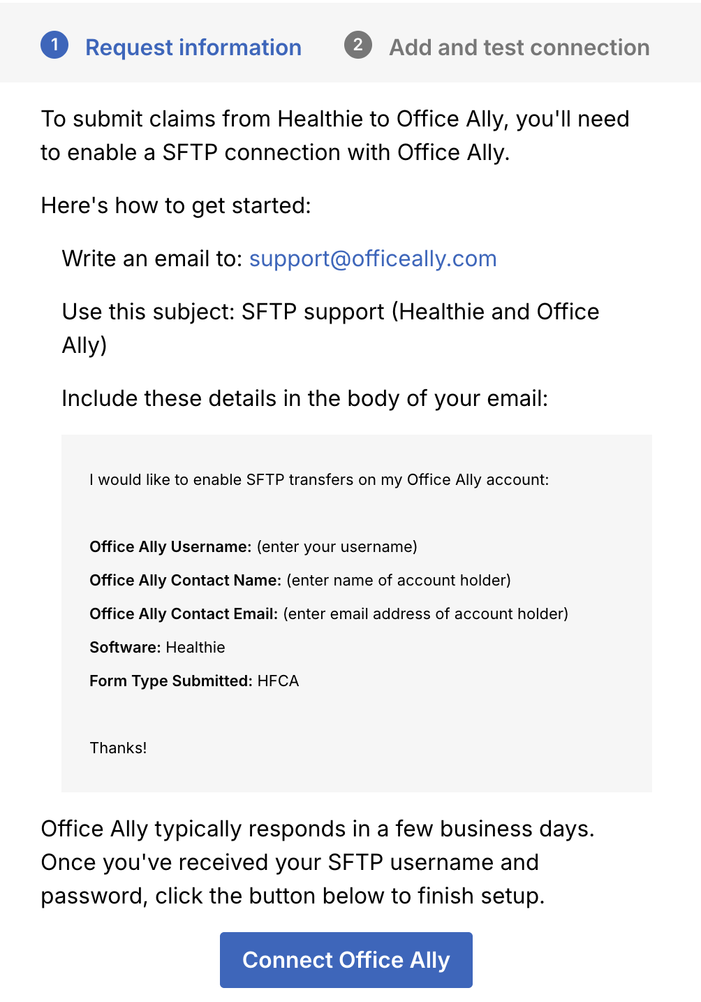 To set this up, e-mail support@officeally.com. Use the email subject: "SFTP Support (Healthie & Office Ally)"