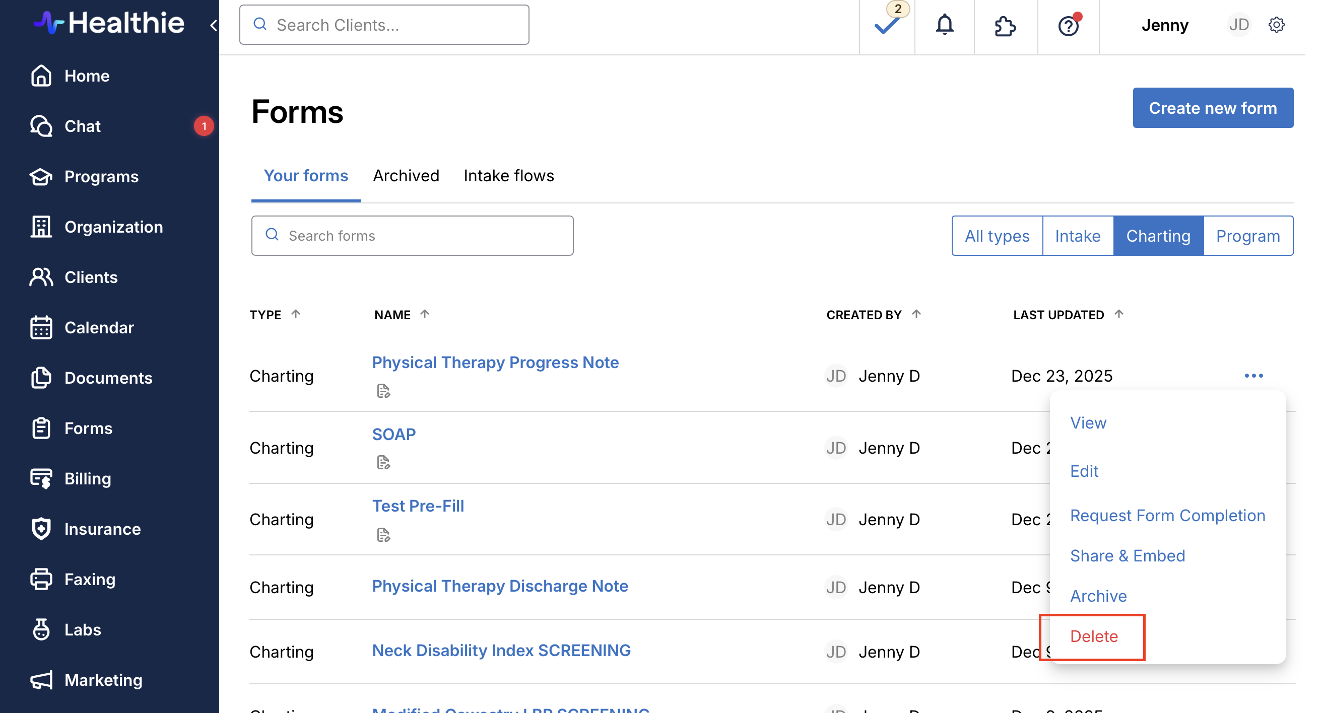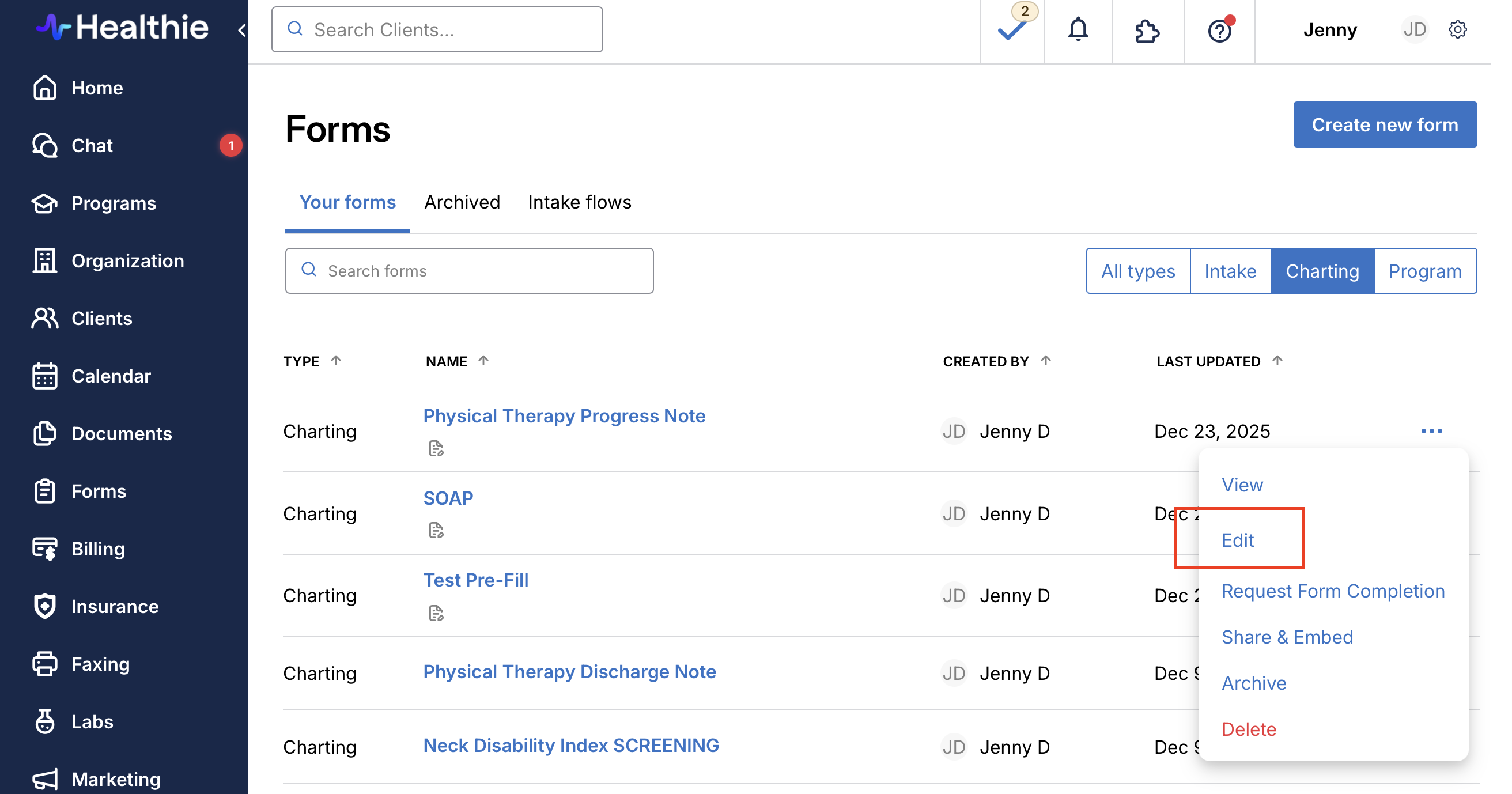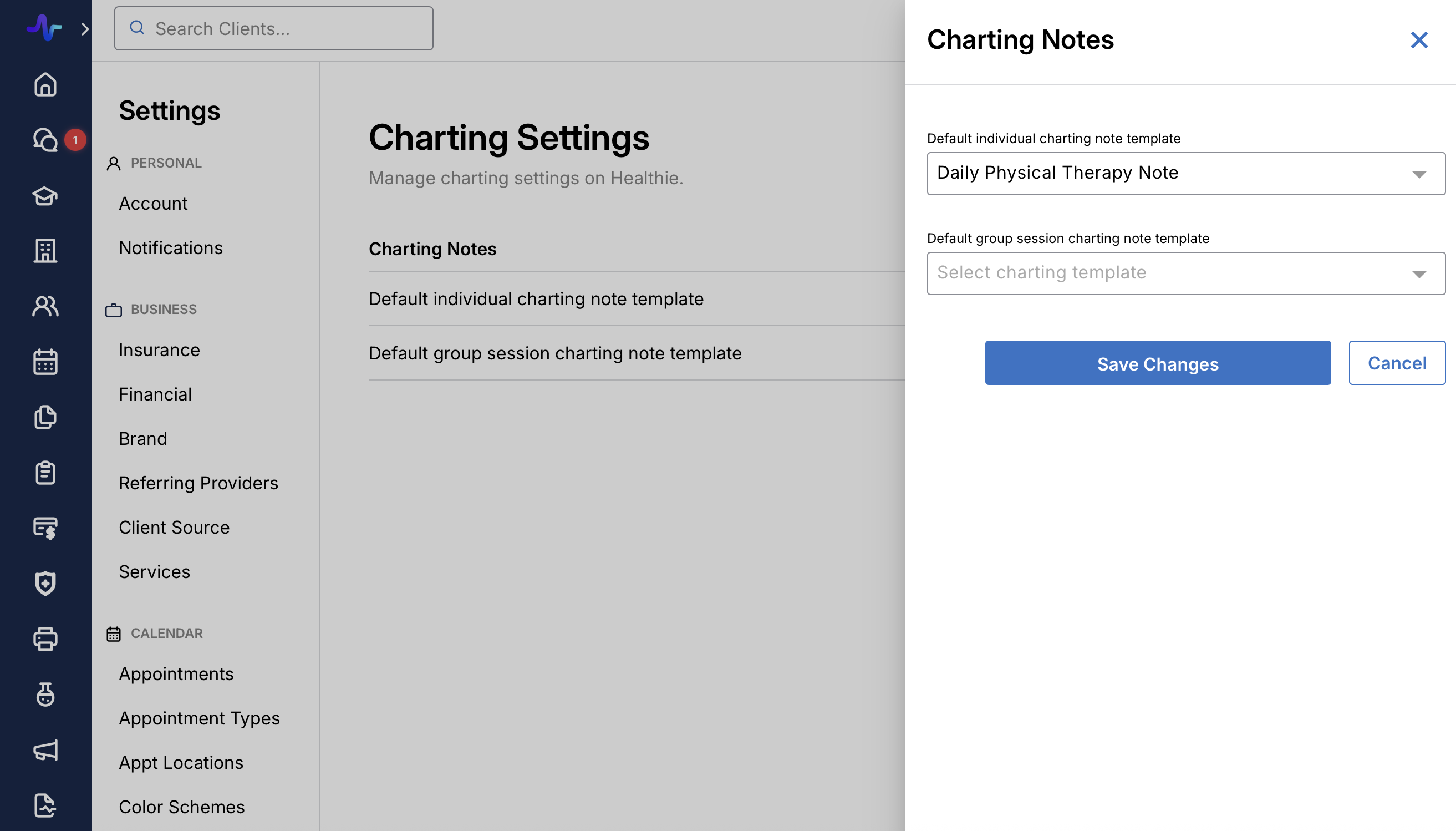 Healthie's Charting feature (EHR) allows you to electronically take notes on clients in an organized way, using customized templates that also allow for automations like pre-fill and incorporation of intake form answers into charting templates. You are able to easily view an archive of client charts, E-fax them to other healthcare professionals, and quickly export information into Superbills and CMS 1500 forms for easy billing.