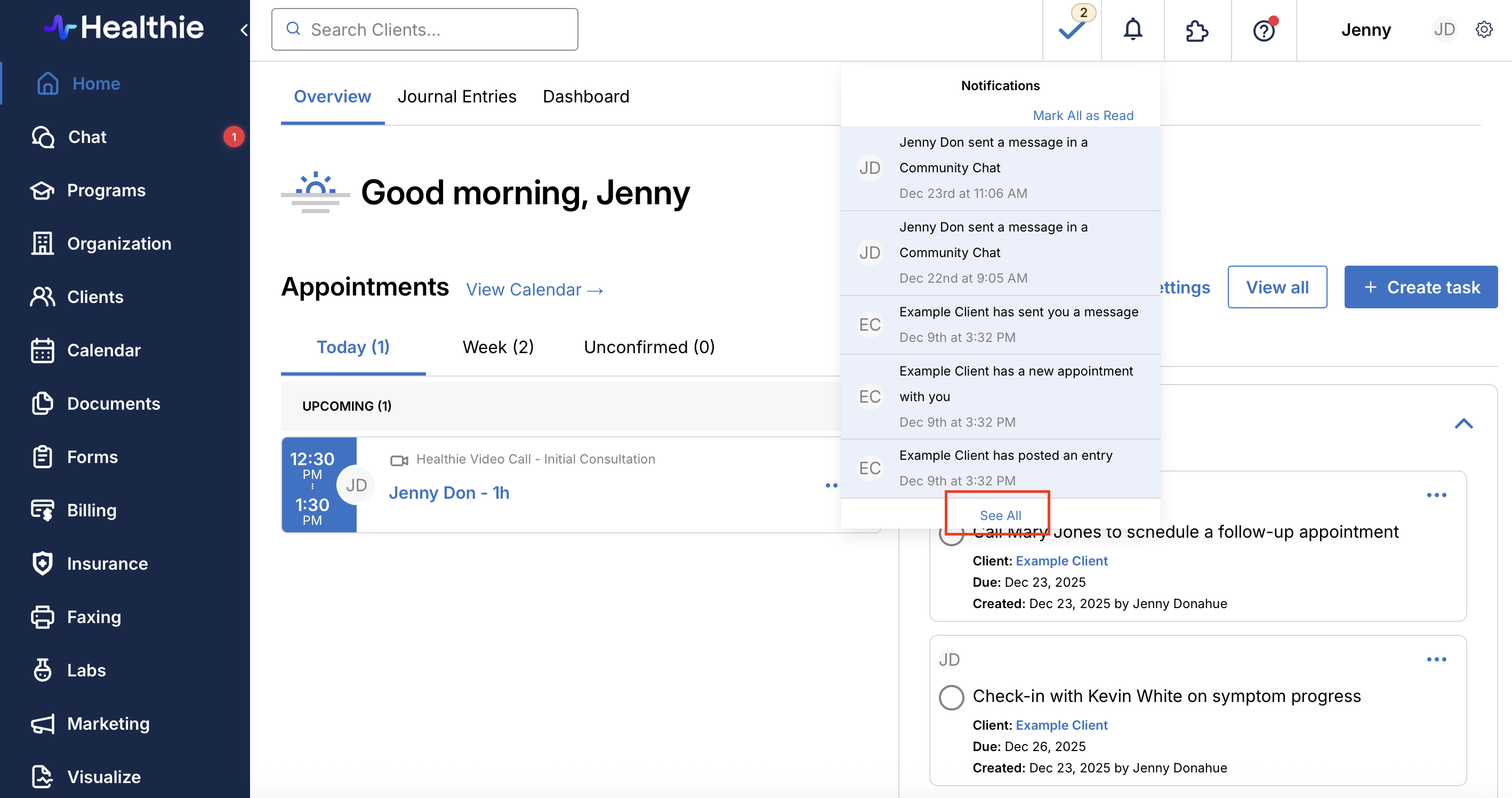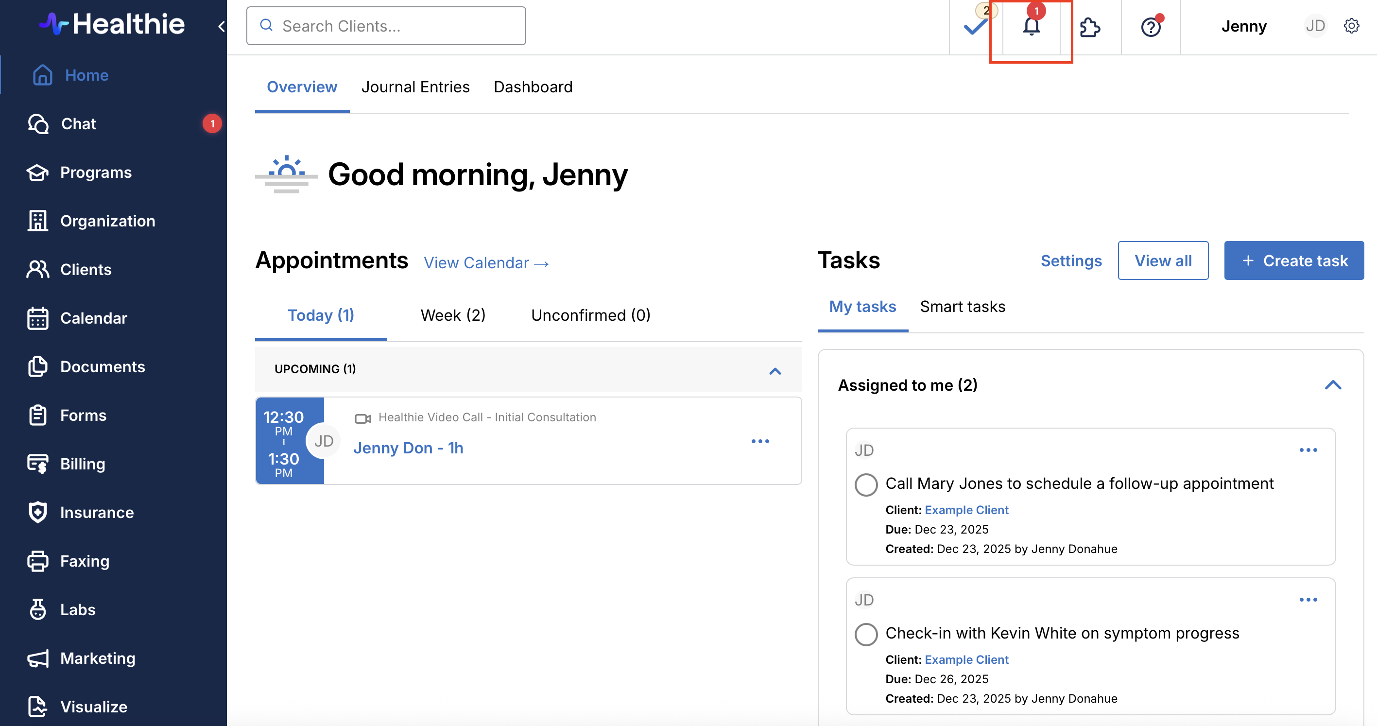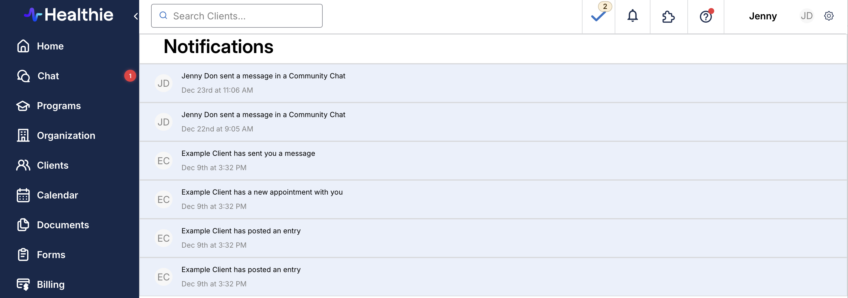 There are several areas where you will get internal notifications in Healthie as a provider. You'll see your notifications when logged in to your Healthie provider account from both the web browser and the mobile app.
