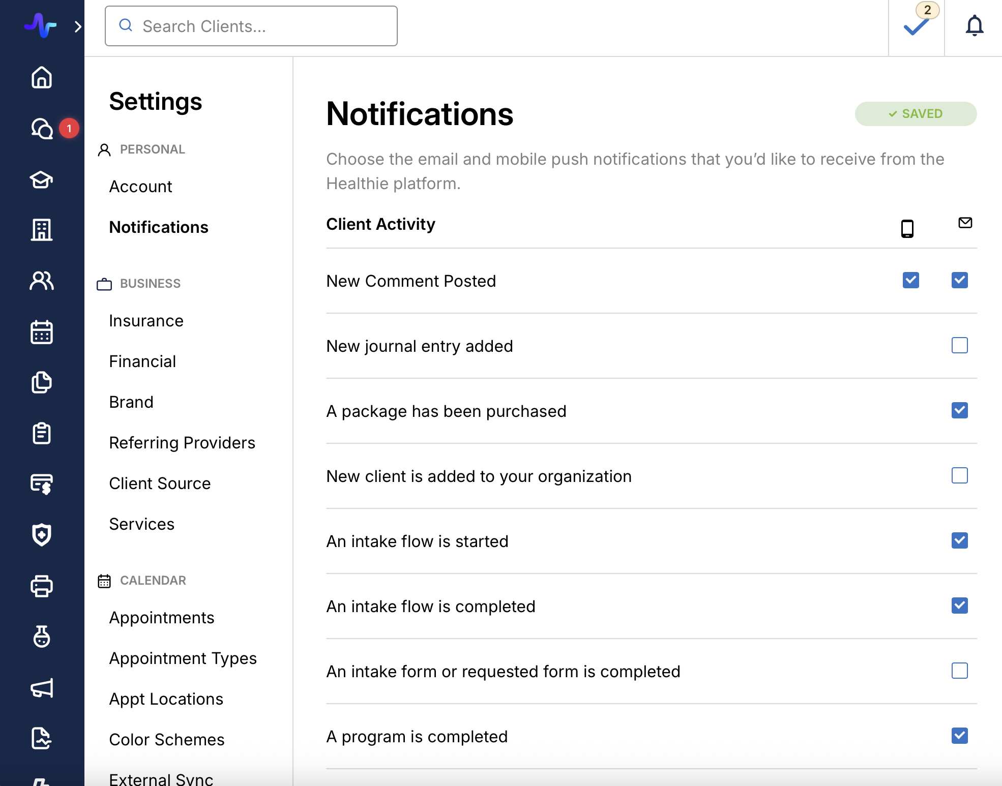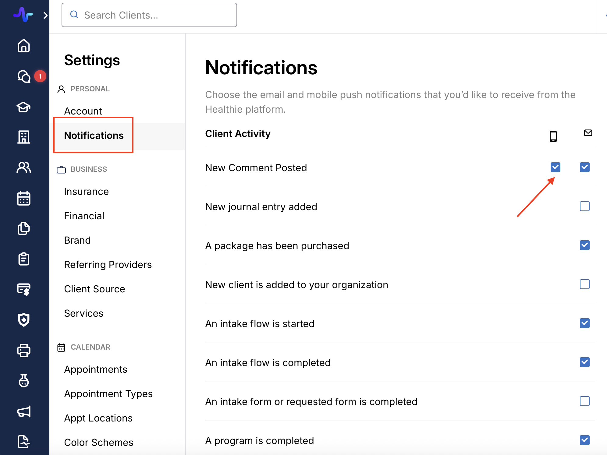 Within Healthie's settings tab, additional push notifications can be enabled for the following: