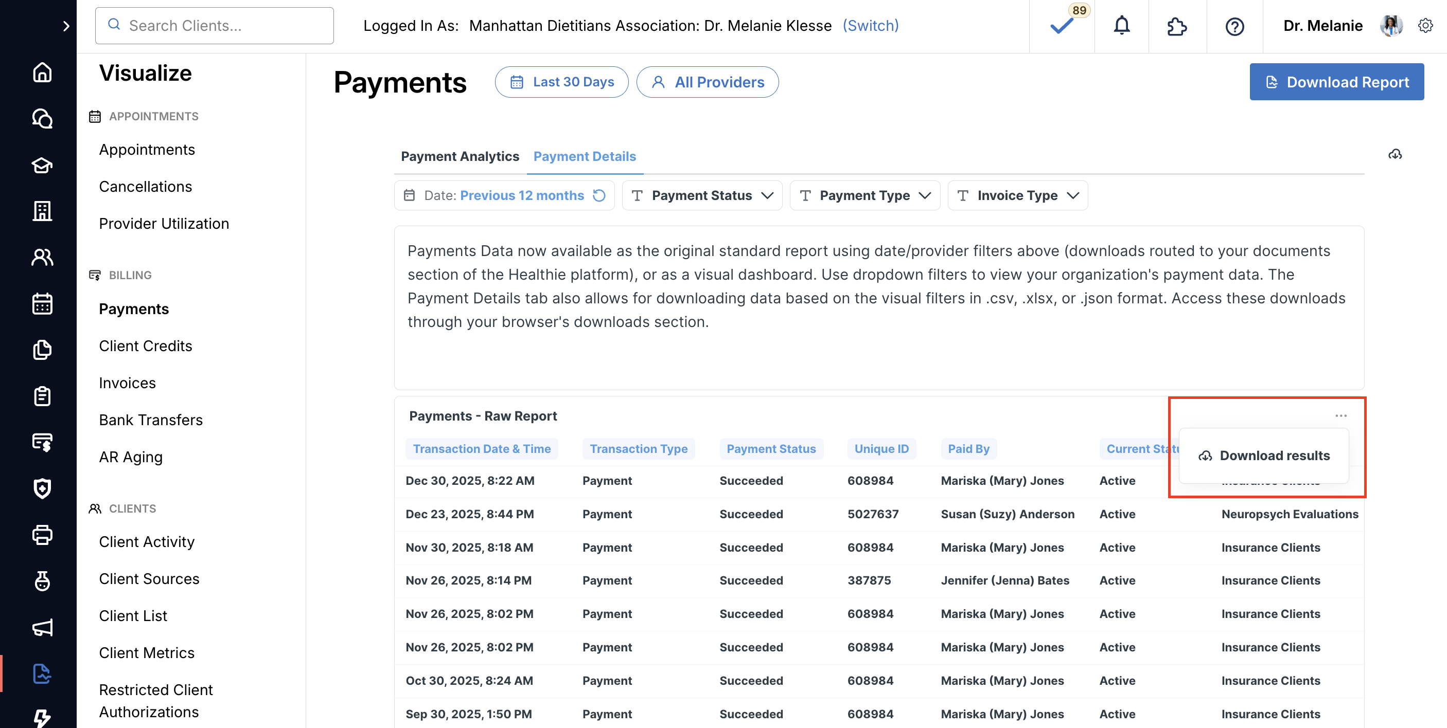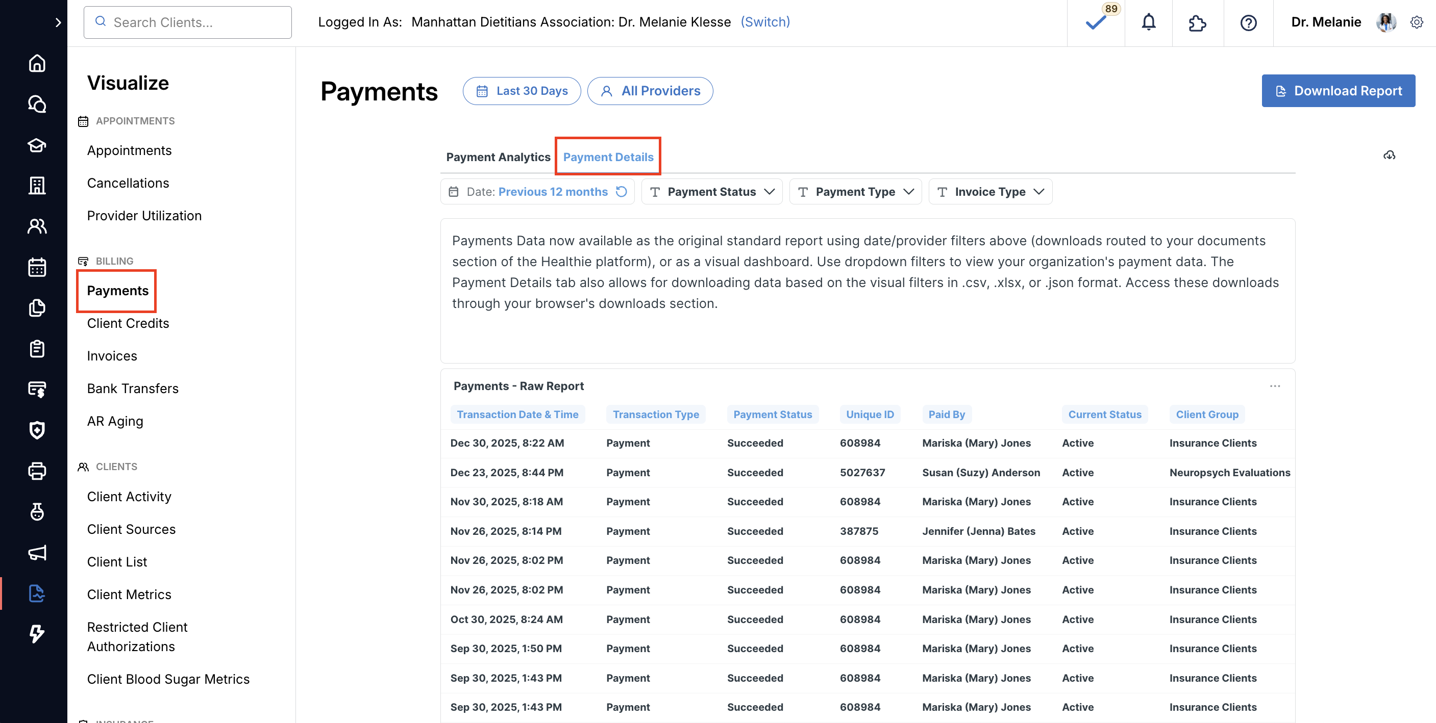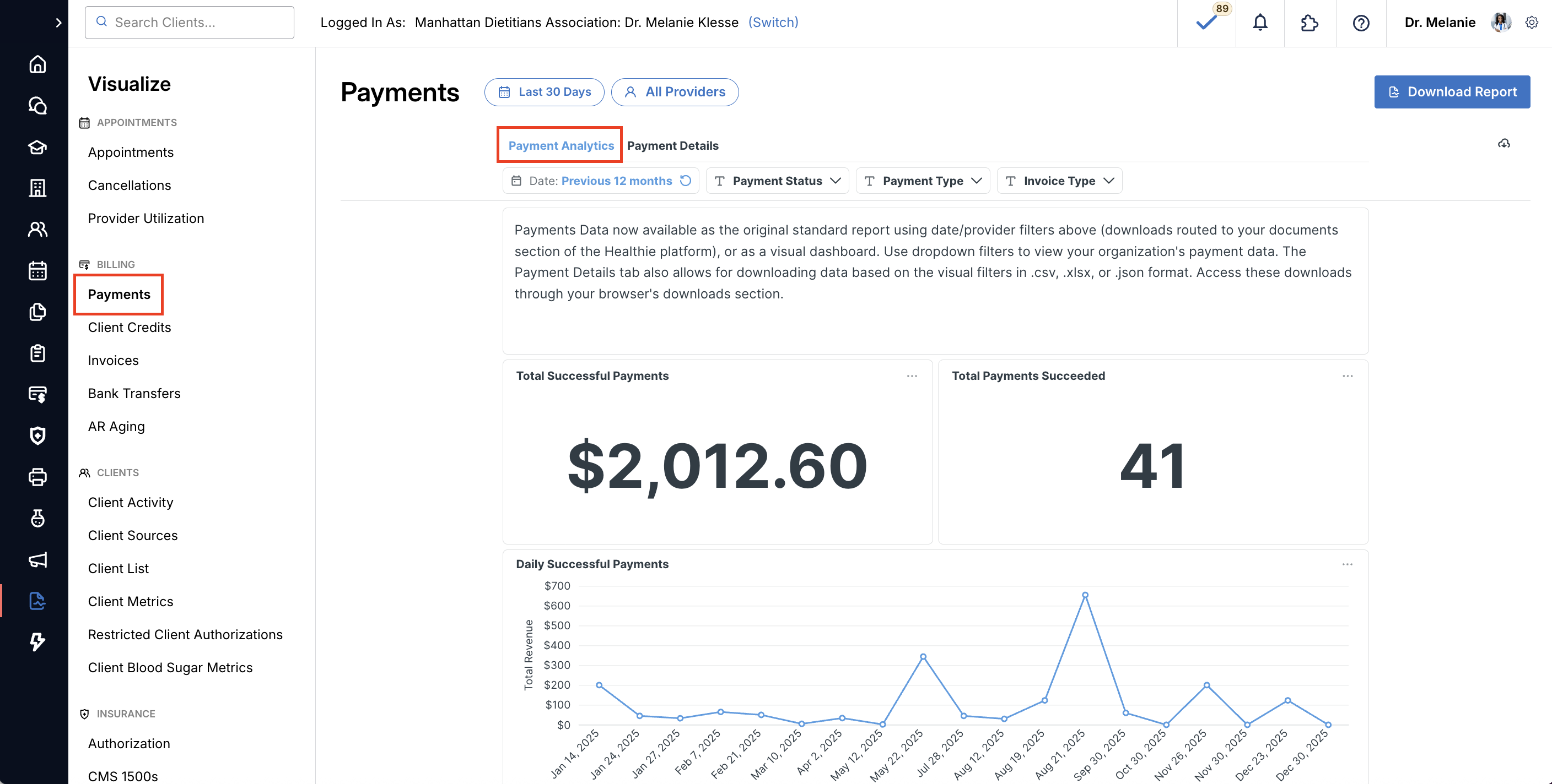 In addition to the .csv file that you can generate, information relevant to Payments will also display visually within Healthie, allowing you to quickly assess financial performance at a glance.