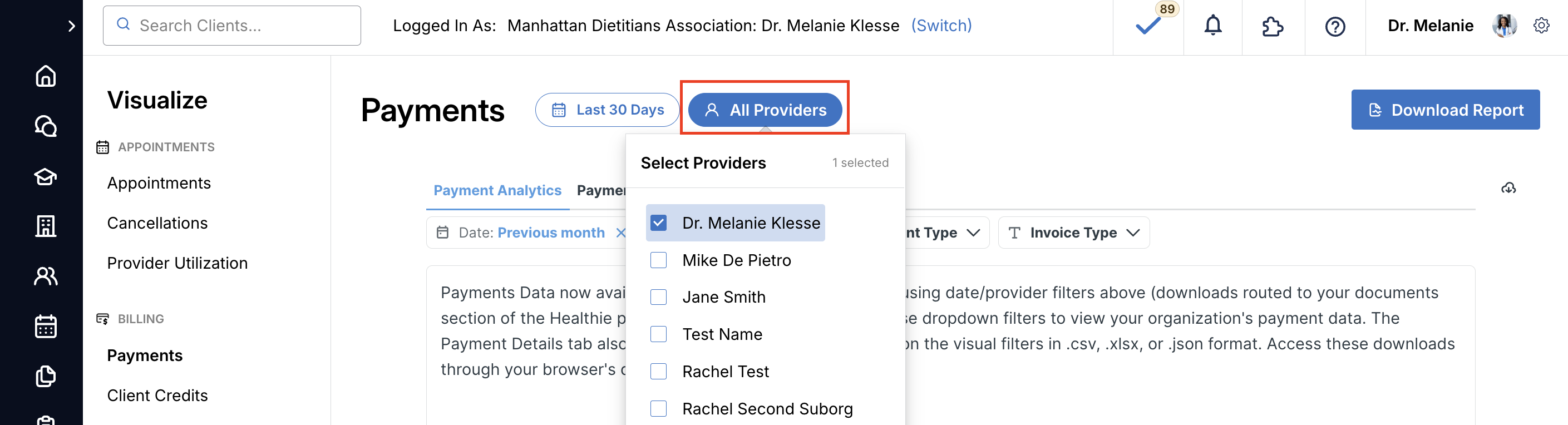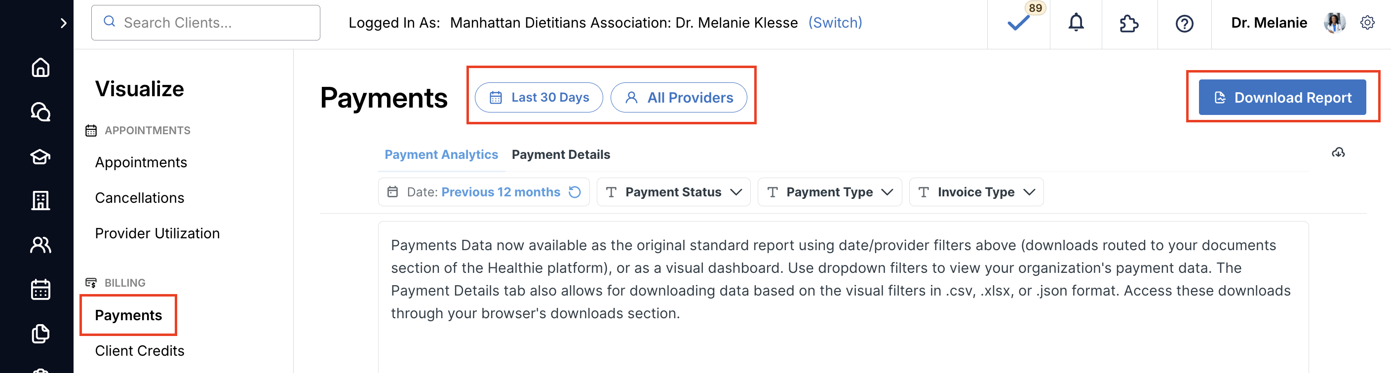 From your Healthie Dashboard, navigate to Visualize > Payments > select the appropriate filters > Download Report. The Report can be filtered by Date Range and Provider.