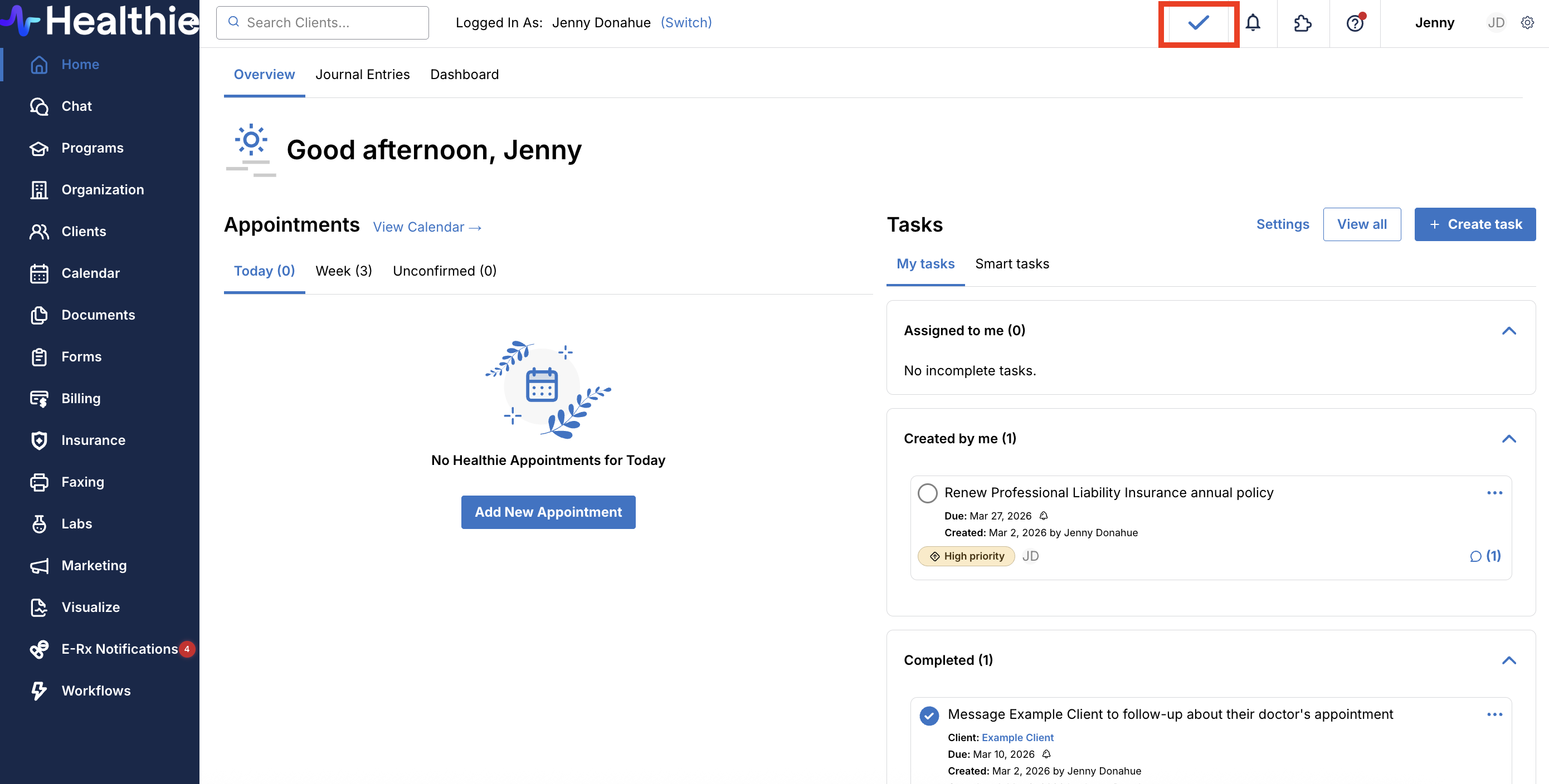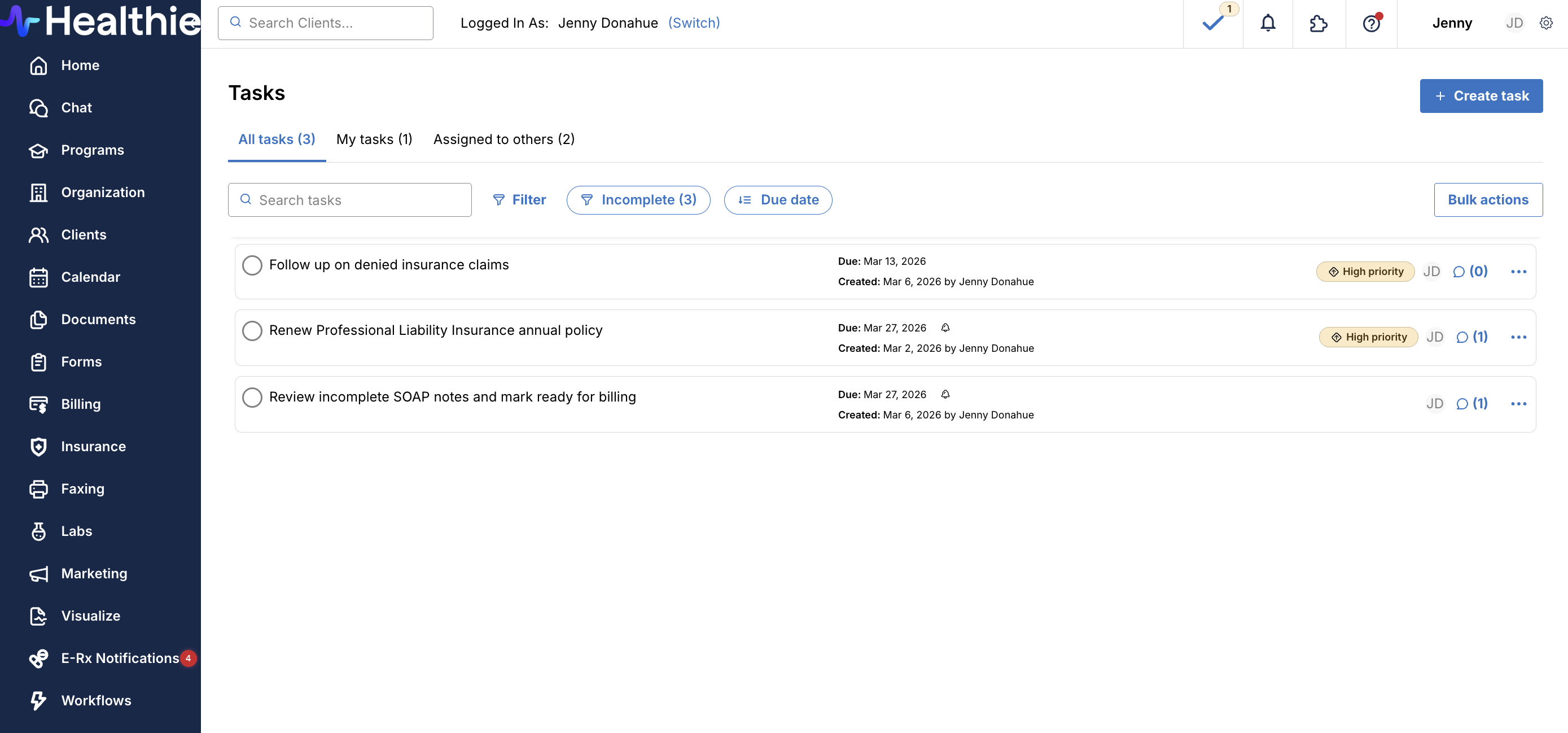 Healthie’s Tasks feature is a structured, built-in to-do list that helps providers and teams stay organized, delegate work, and complete important actions across client care and admin operations. Tasks make it easier to coordinate work, assign responsibility, and ensure nothing falls through the cracks — whether you’re managing a solo practice or collaborating across a growing care team.