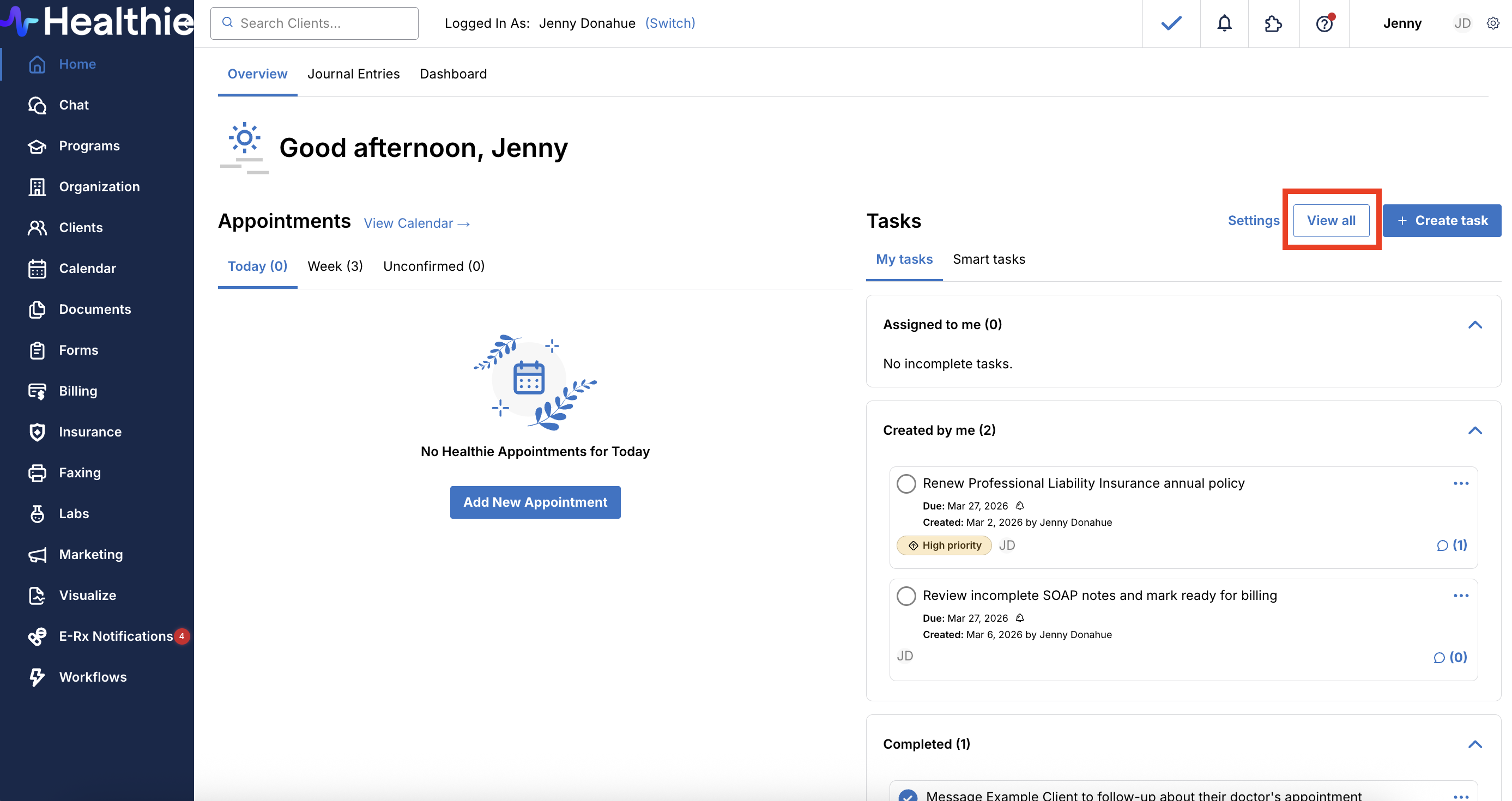 From your Healthie dashboard, click View All to open the full task list. This brings you to the Tasks Dashboard, a centralized workspace for managing all your to-dos.