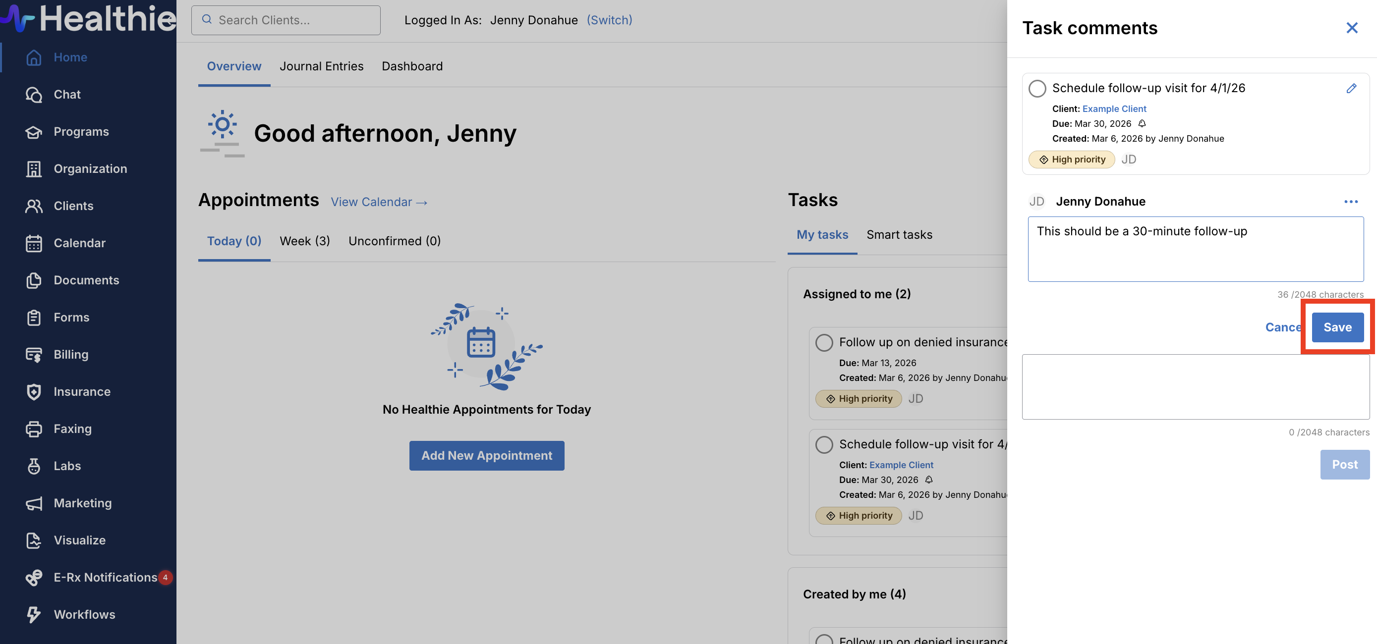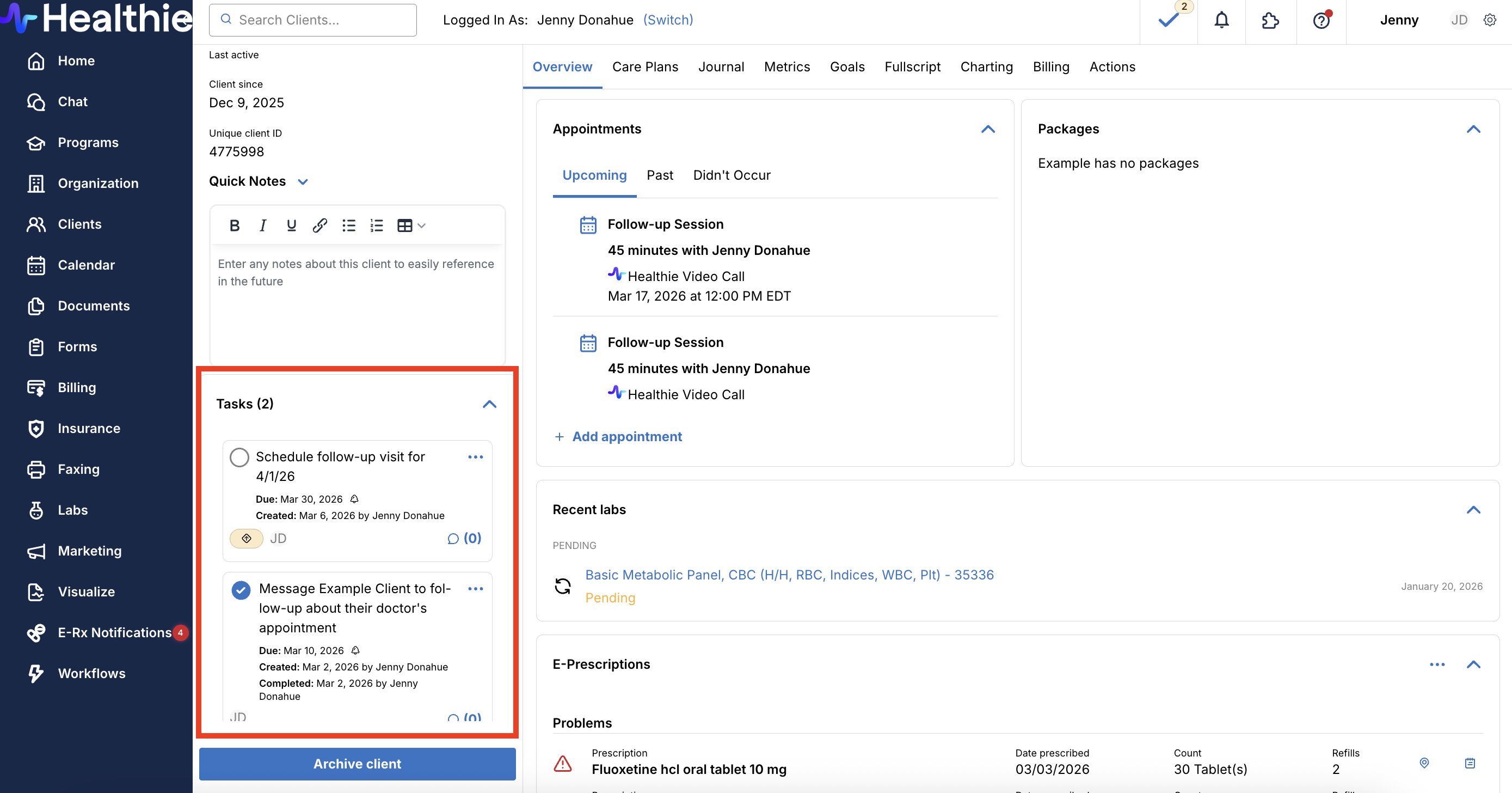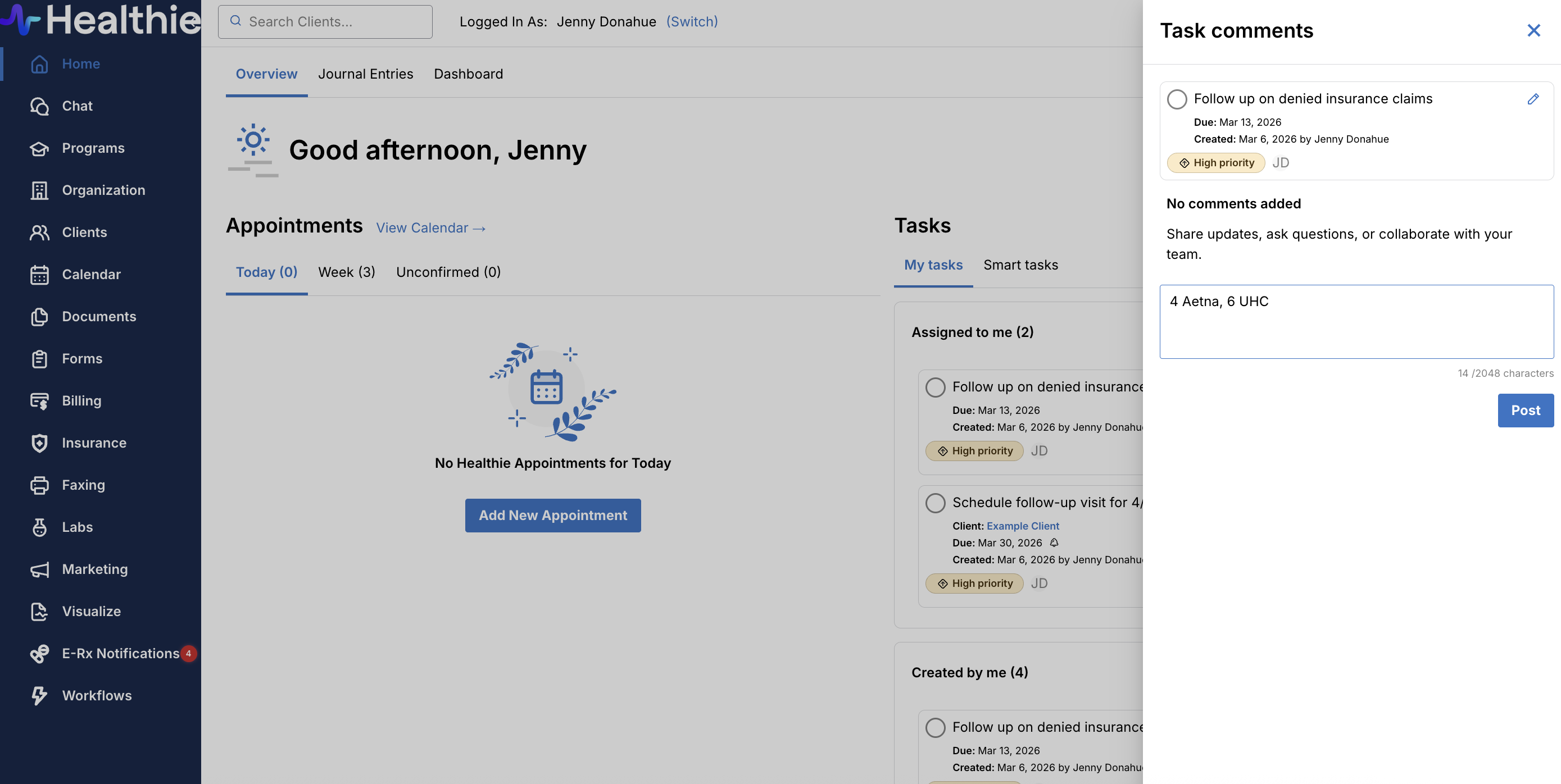 Easily stay on top of administrative and clinical to-dos with built-in task management in Healthie.