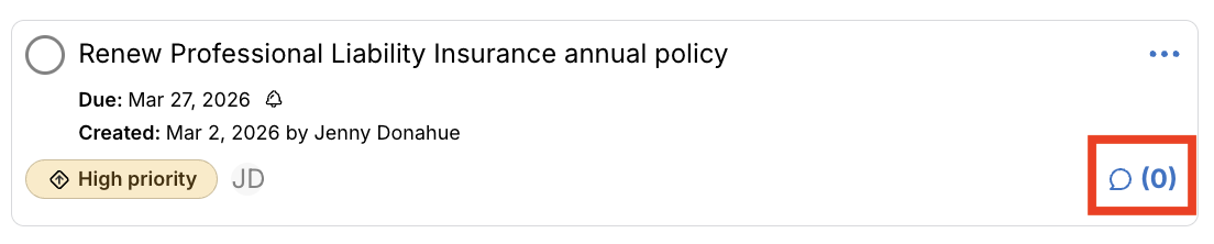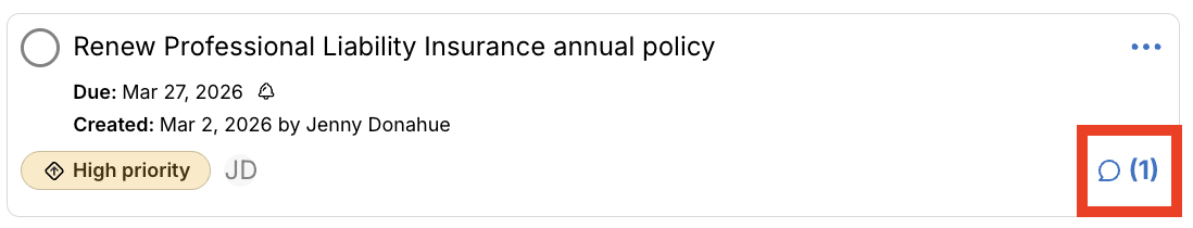 Once you click save, your comment will appear in the comment history with the date created and commenter's name. The comment icon will also update to reflect the number of comments.