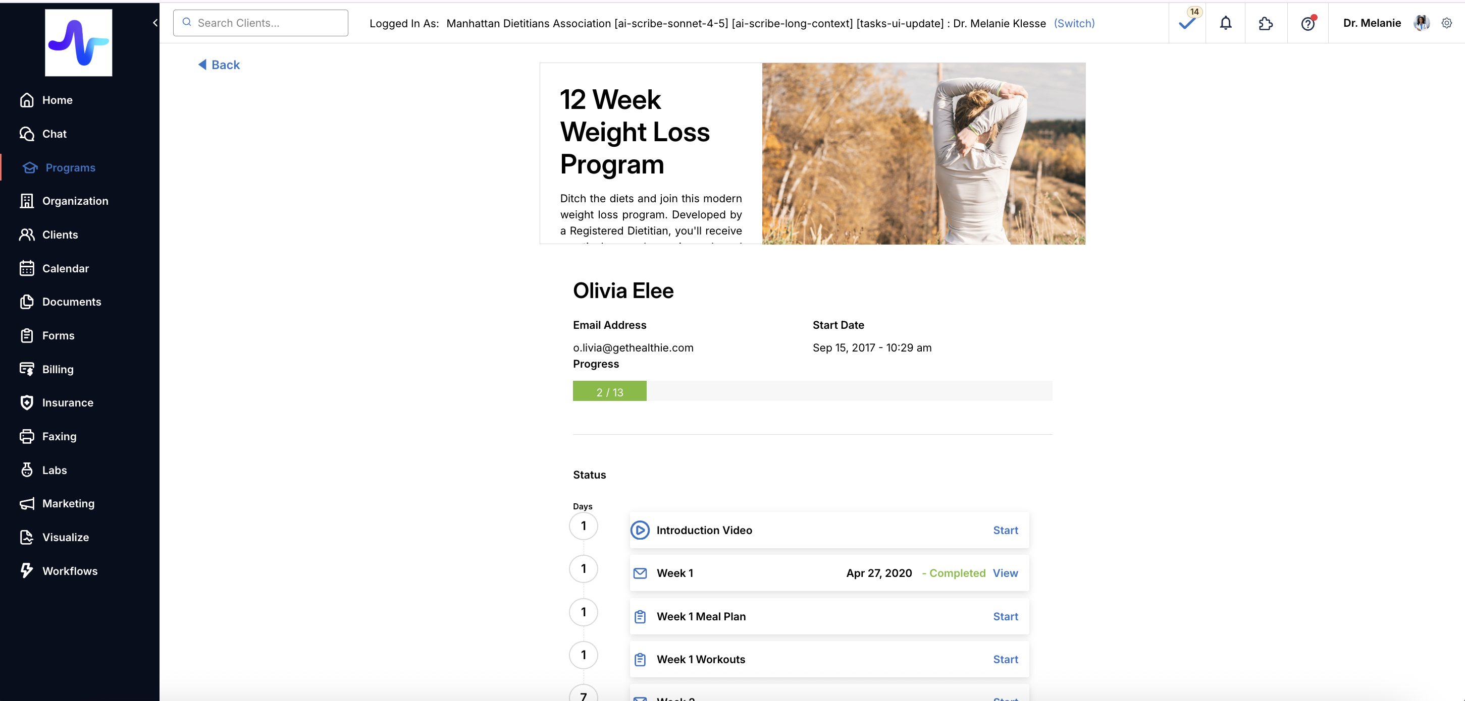 Through Healthie's Program feature, you have the ability to keep tabs on each client's progress throughout your program. This will allow you to provide motivation/support to any clients that need, view client responses to forms/surveys/quizzes, and overall assess the performance of your program.
