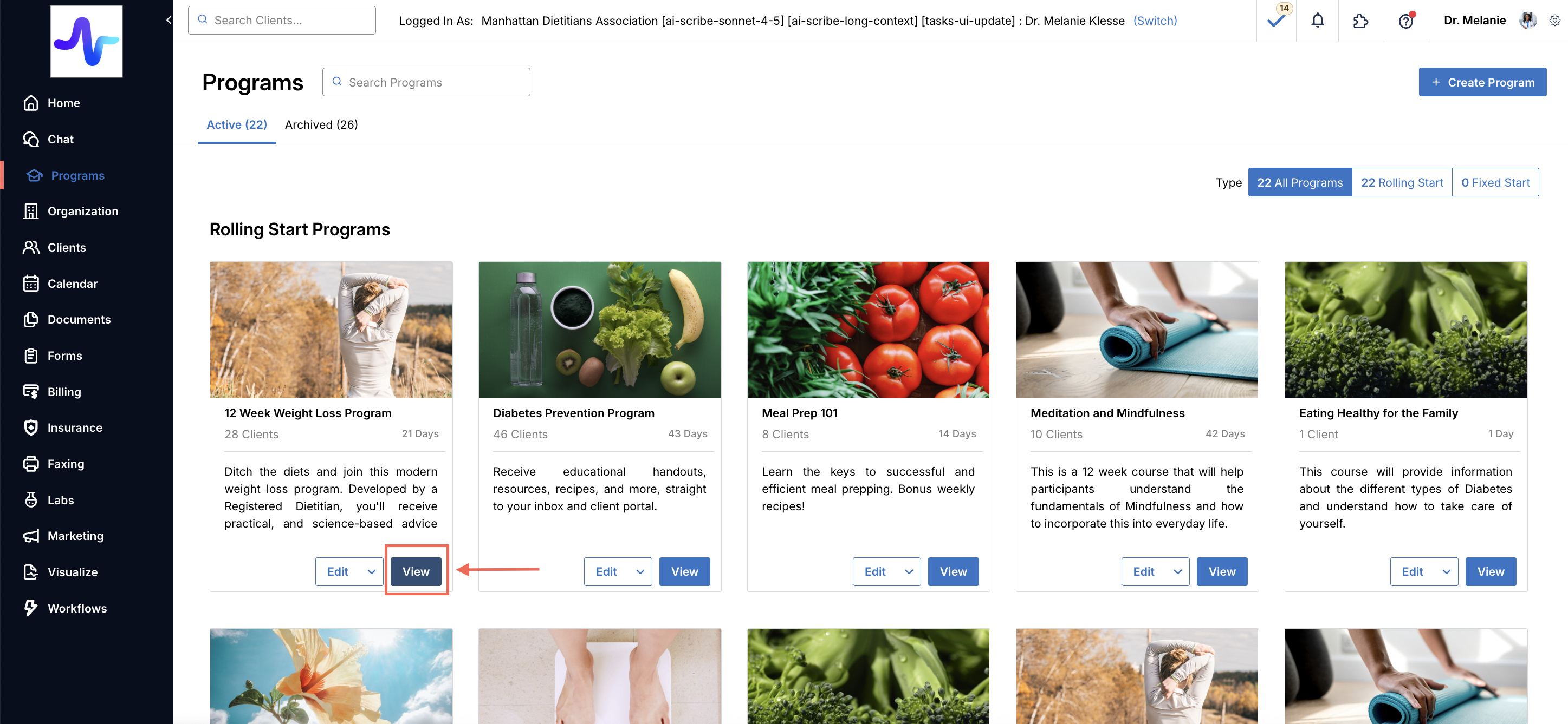Navigate to the Programs feature from your Healthie provider account (Dashboard > Programs). You'll see a list of all of your created programs, and can quickly gauge the length of time of the program, and how many clients are enrolled.
