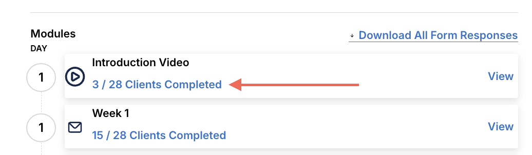 By clicking View for any client in the program, you'll be able to take a closer look at their particular progress, module by module. This includes completion status and date of completion.