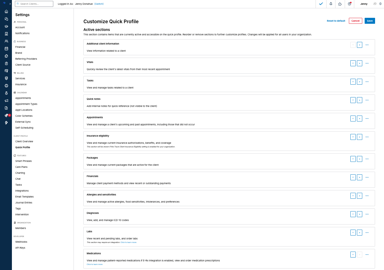 Organization owners can customize which components appear on the quick profile to show the most relevant information clinicians need to see while charting, taking notes, and delivering care.