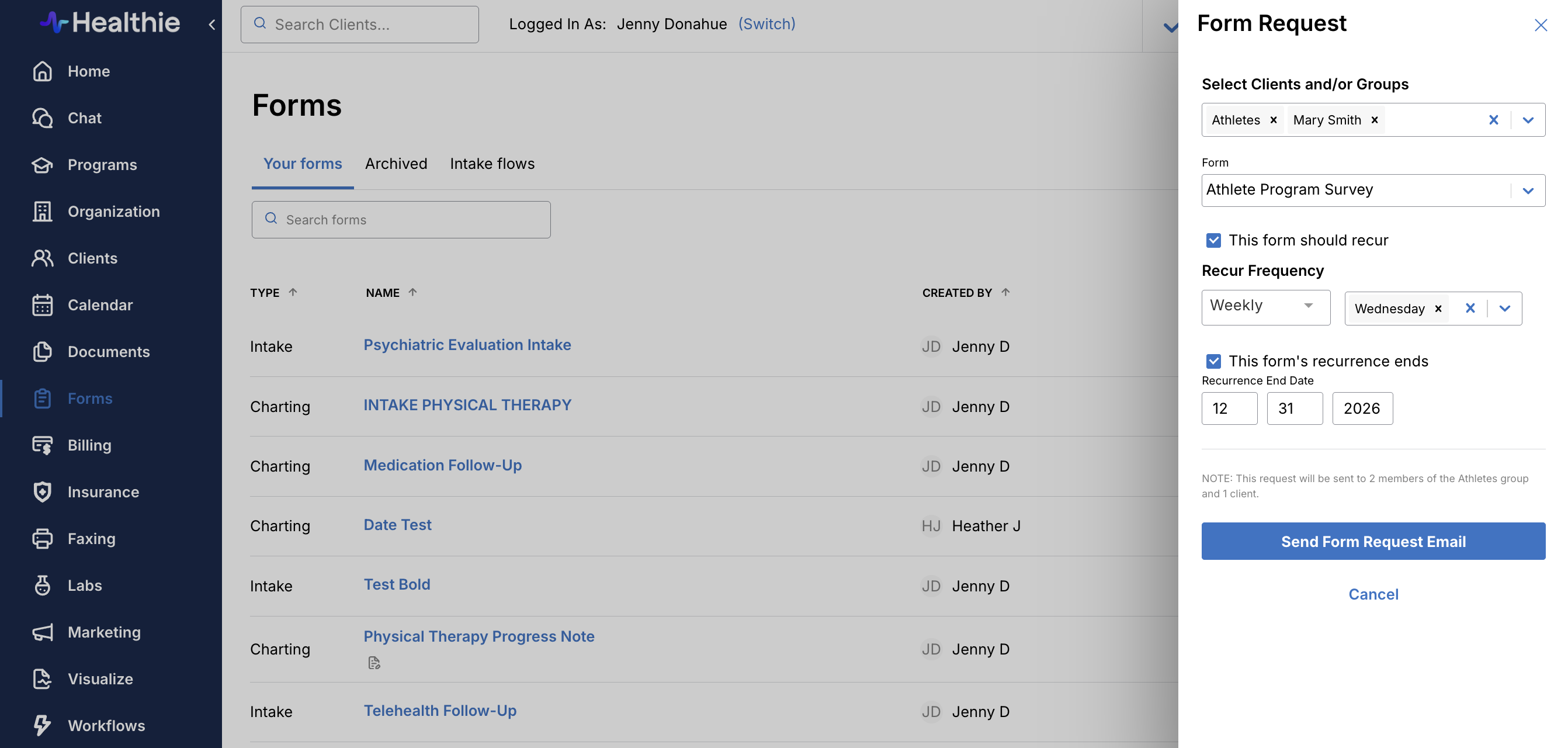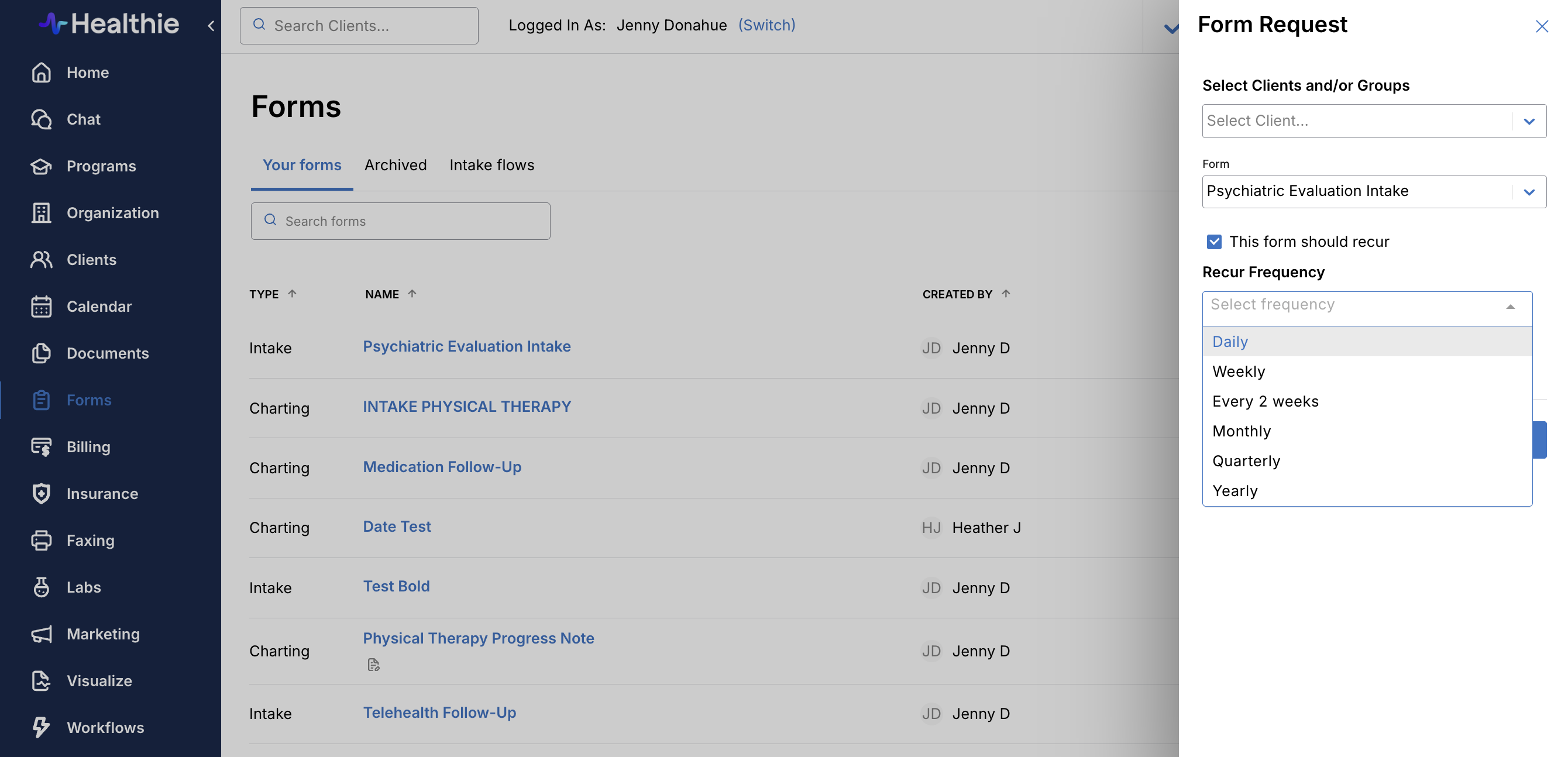 You can set this up within Healthie to apply to clients and/or groups, such that it's possible to request a form completion from multiple clients or groups at the same time. You are also able to select the frequency of when the form will be requested for clients to complete (daily, weekly, monthly, or multiple times per week).