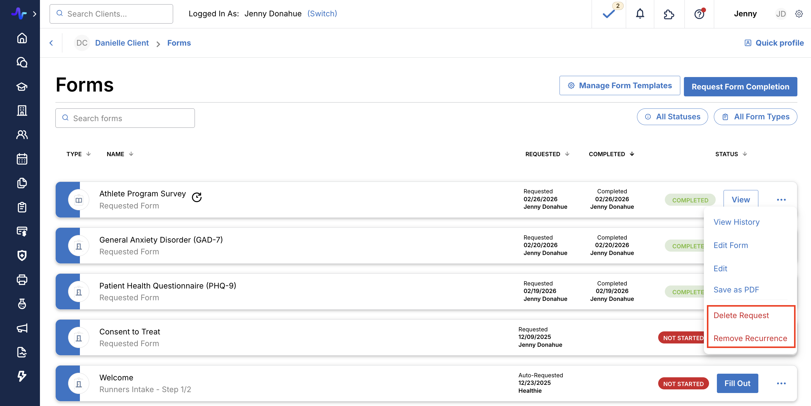 Click the status next to the form. Recurring forms are indicated by a recurring time icon. From the drop down, select Remove Recurrence or Delete Request. Remove Recurrence will remove all future recurrences of the form for that client, while Delete Request will remove the single, scheduled occurrence.