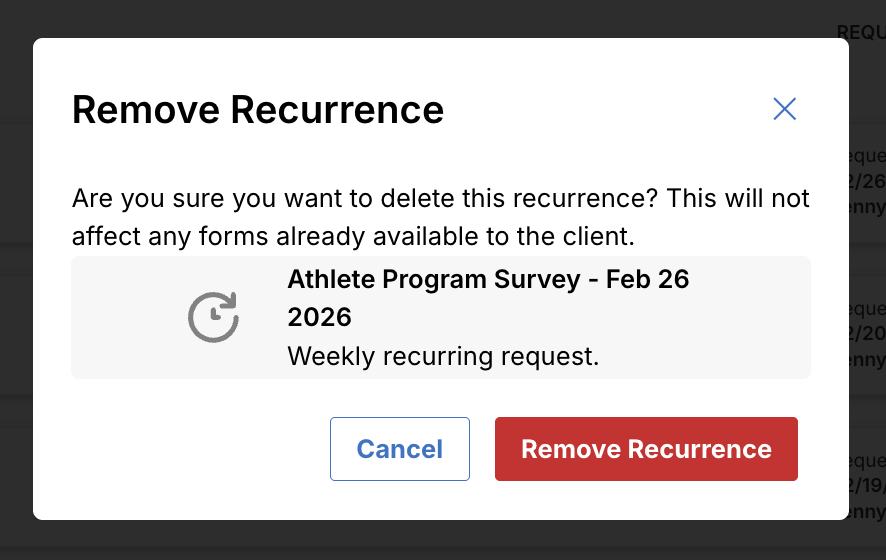 When one of your forms has been sent/requested, you can also select Remove Recurrence which will stop future recurrences/future form requests for that form from being sent out to that client at all.