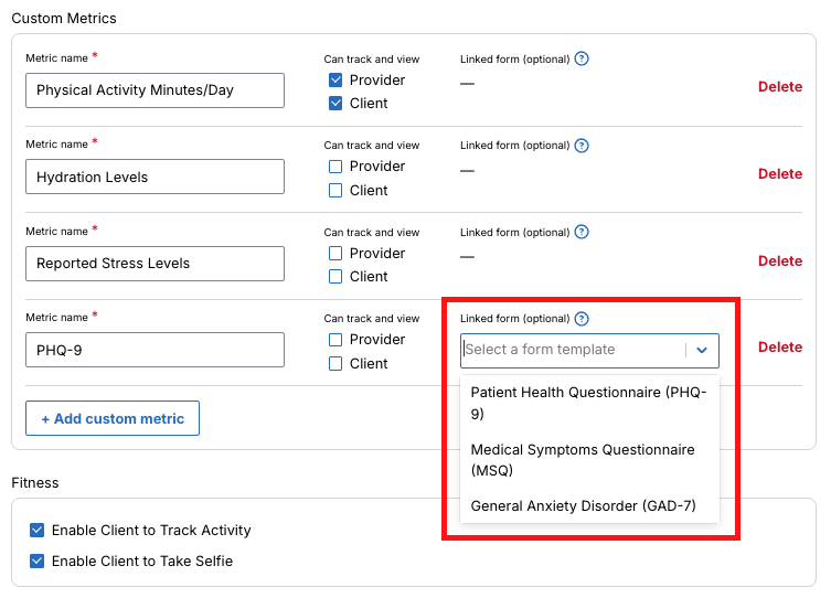 Healthie enables you to link a custom metric directly to an auto-score form. When a client completes a form with automatic scoring enabled (e.g., PHQ-9 or GAD-7), the form's score will automatically populate into the linked custom metric. To link a custom metric to an auto-score form:
