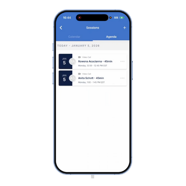 Your list of appointments shows important information at a glance including the client, appointment type, date and time, as well as the contact type (in-person, video call, or phone call). Tap an appointment to view additional session details or launch a video call. You can also click the actions tab (three dots) to modify or cancel the appointment.