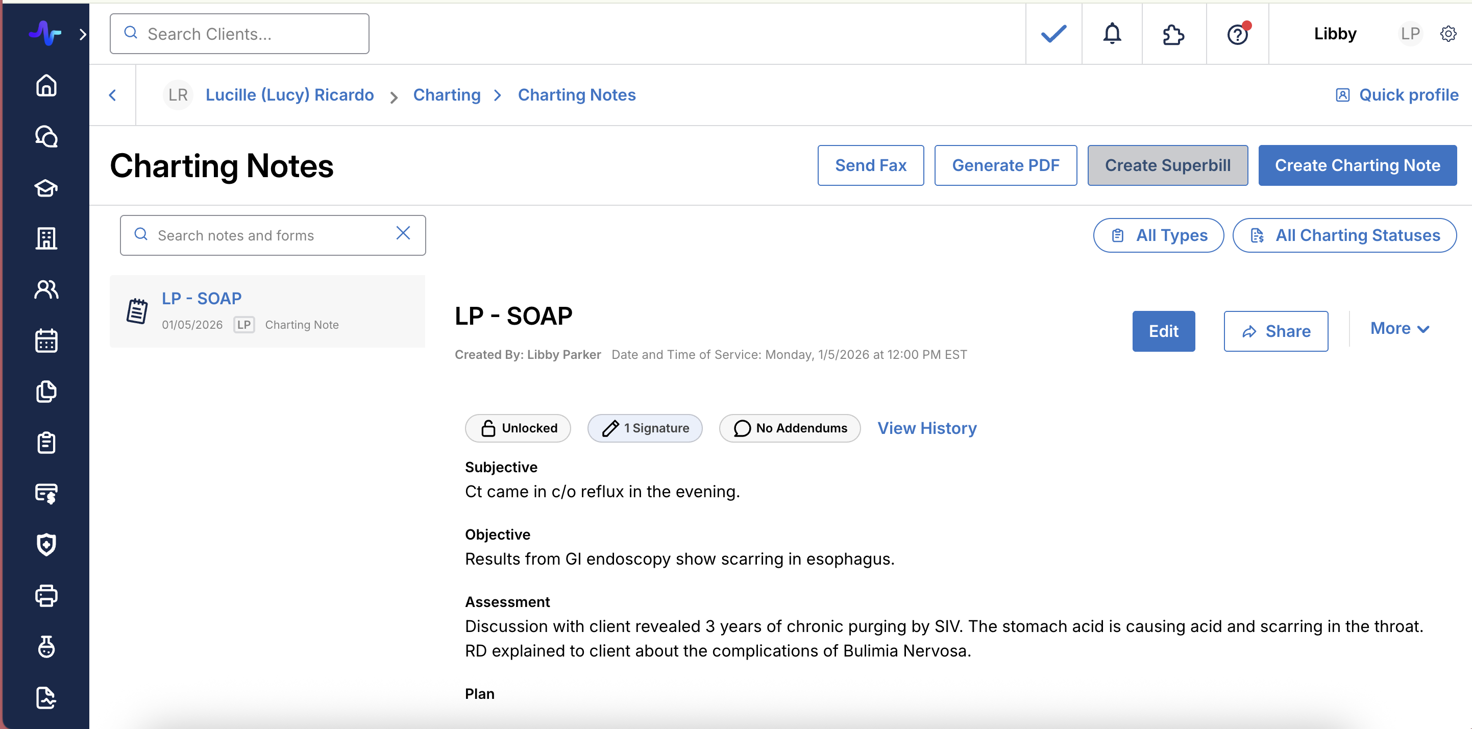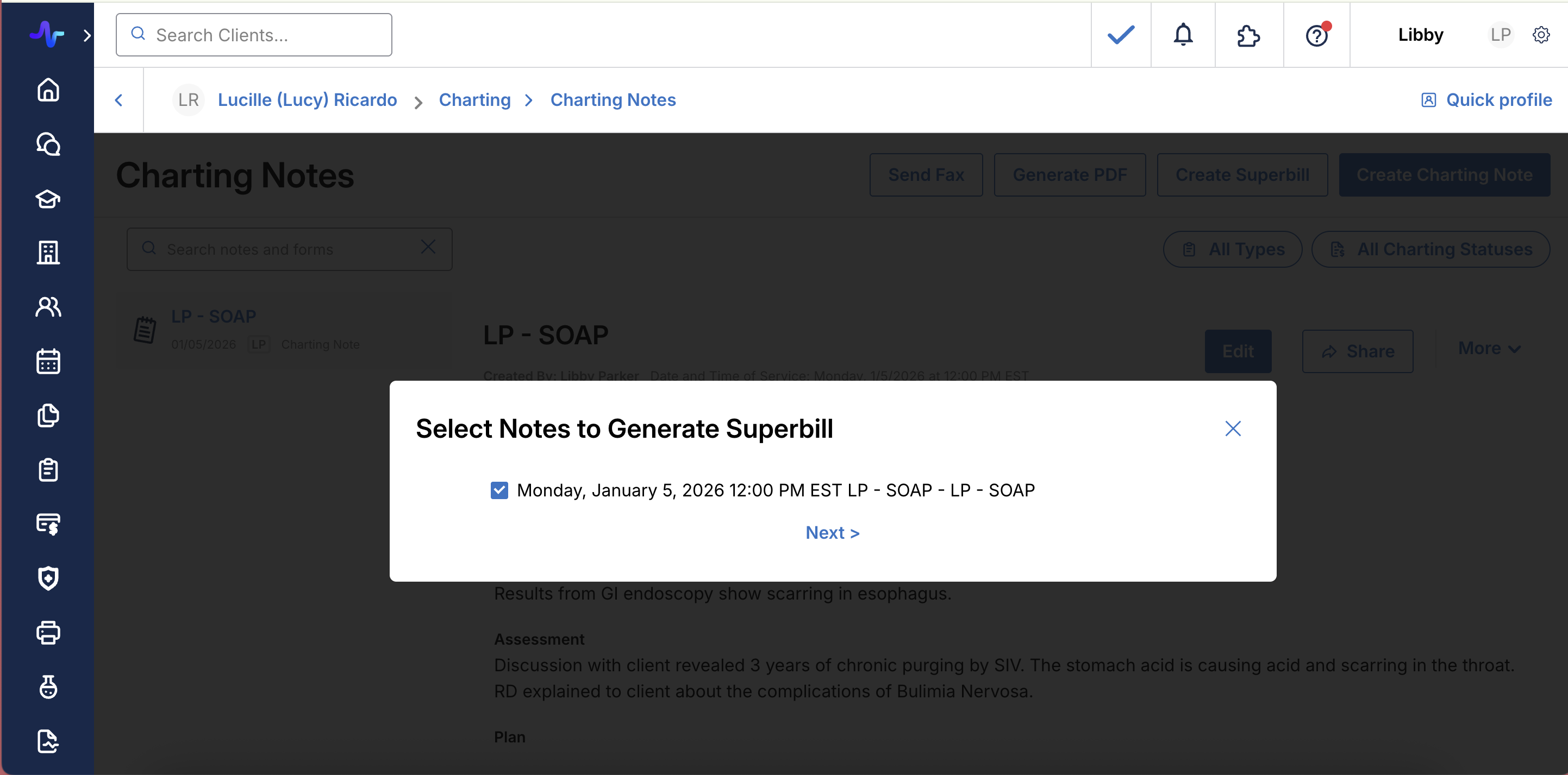Within Charting Notes > Create Superbill > Select Notes To Generate Superbill > Complete required fields > Create Superbill to Generate and Share your Superbill
