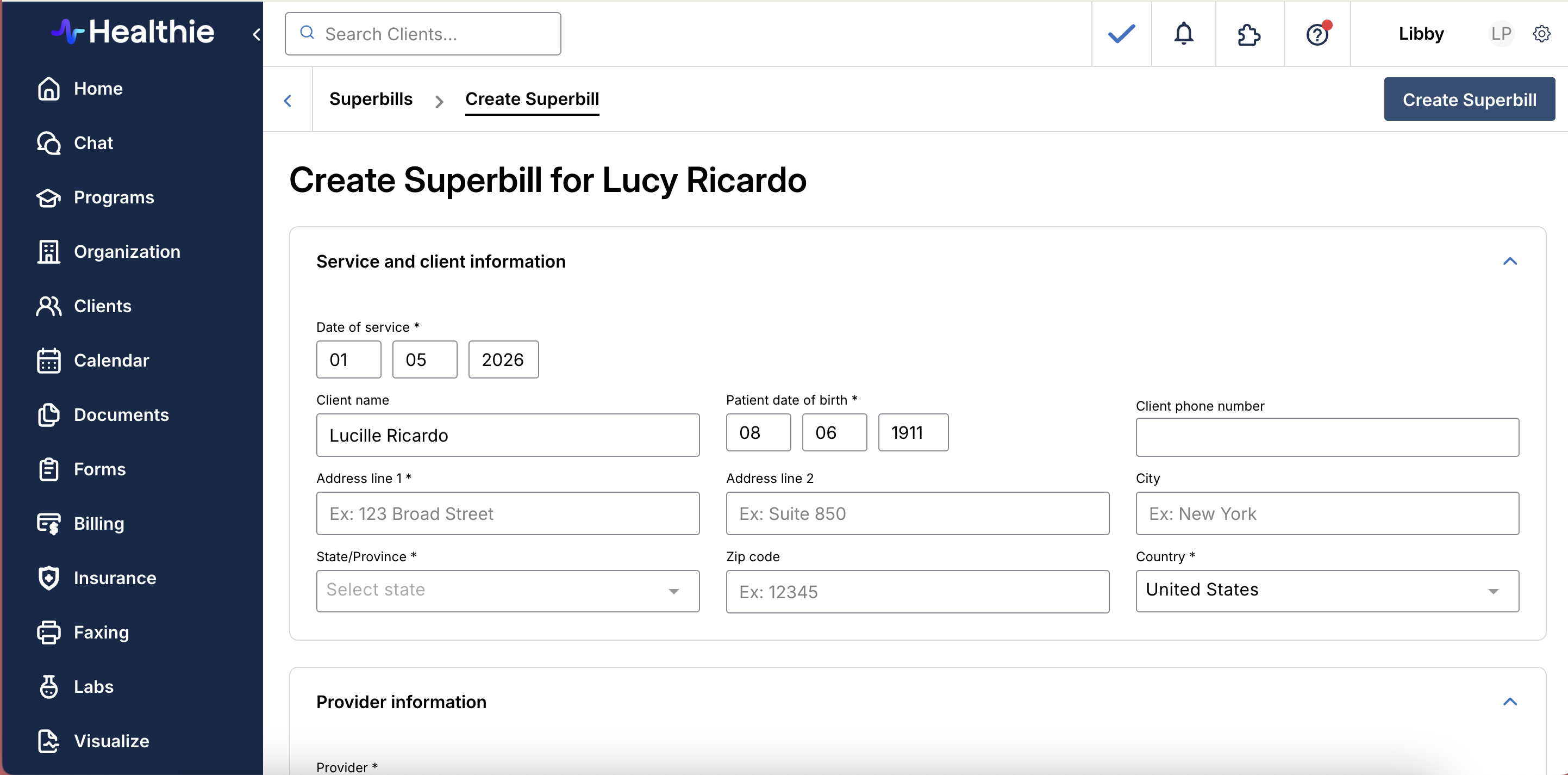 Superbills can be saved and downloaded as PDFs or sent directly to your client.