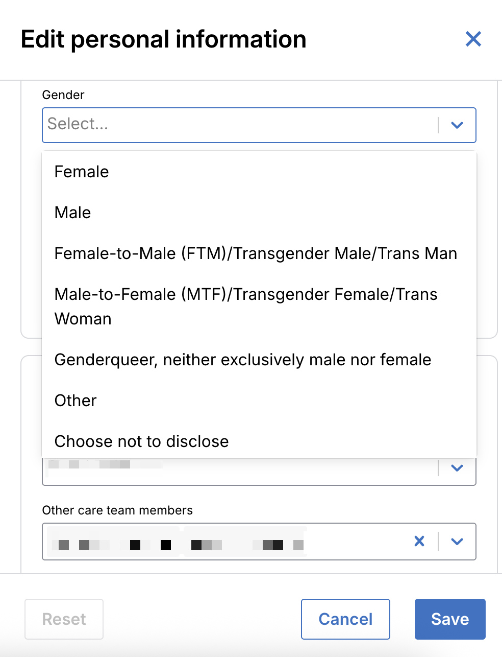 Within the Gender field within a client's profile, you'll see the below options under Personal Information in the dropdown: