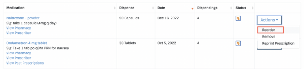 Access the E-Prescribing portal > Client's Prescriptions > [...] > Reorder