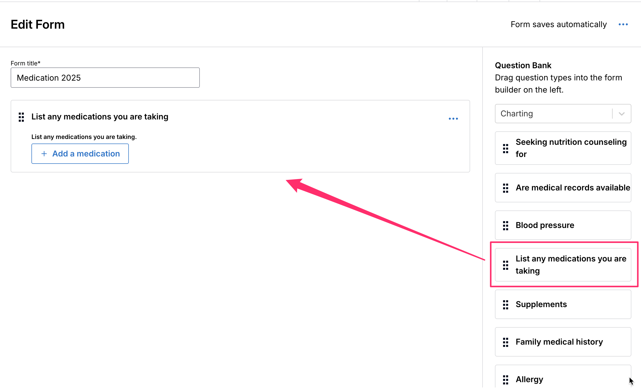Providers can include the medication field to a charting form, following the same steps outlined above. Having a medication field in a charting note will allow a provider to verbally collect this information from the client, or to manually add it directly to a charting note.