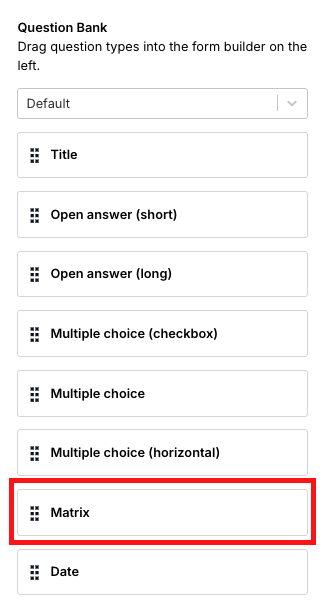 To add a Matrix field, you first need to start a new form or edit an existing form within the Form Builder. In the Question Bank > Default questions, you can scroll to find Matrix.