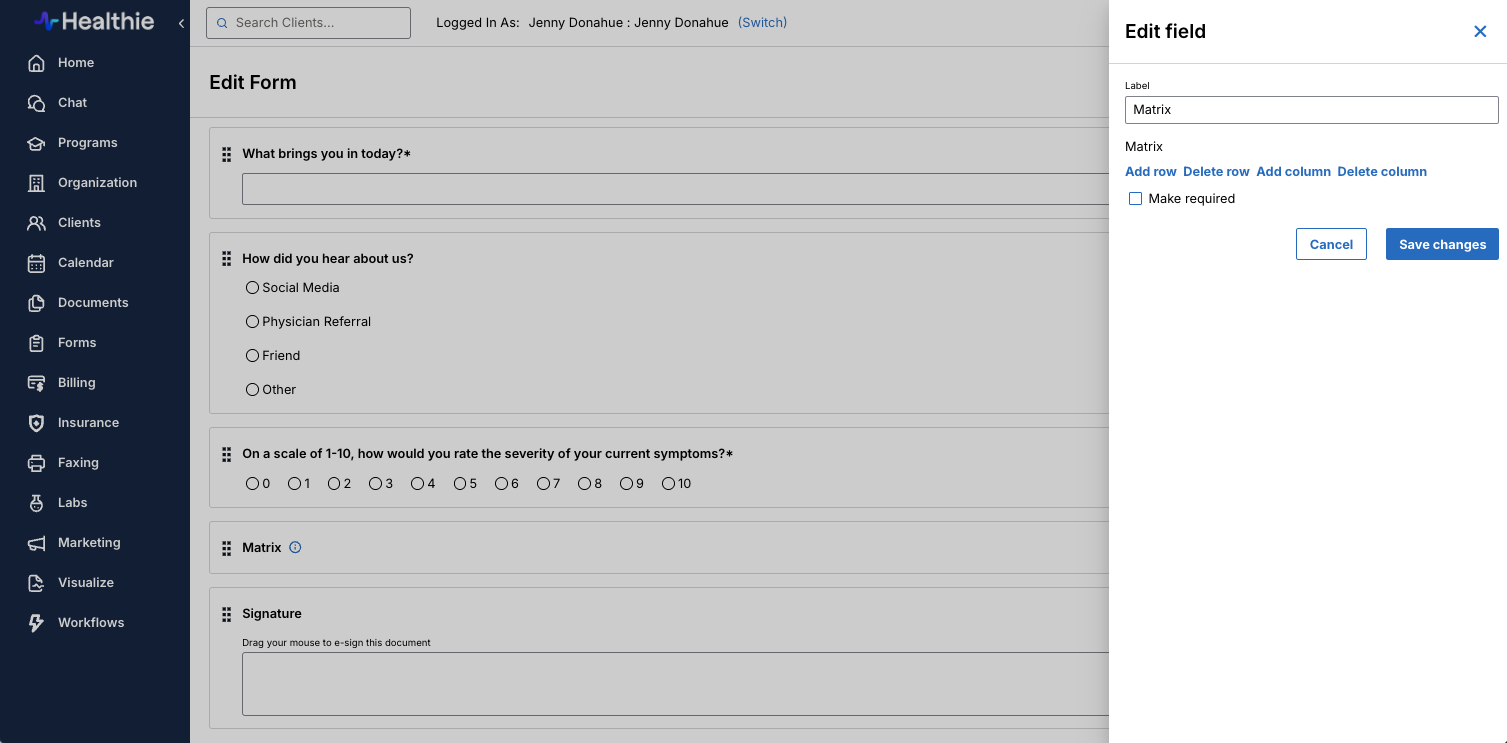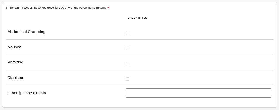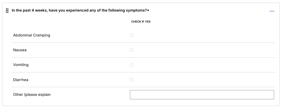 Healthie's Form Builder allows you to pull from many field formats, from multiple choice, to short answer, and free text. In some instances, you may find the need to use a chart, or Matrix, as it's called in the Healthie Form Builder.
