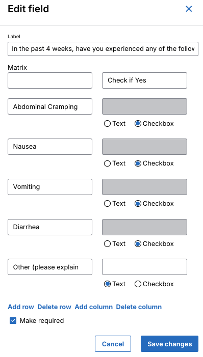 Just as with a typical chart, you can text into fields to add column or row labels - leaving a column or row header BLANK will prevent the header label from displaying (see example below, we've created a Matrix but left the column header above the symptoms BLANK. When viewing the Matrix, this field does not appear. Alternatively, if we had typed "Symptoms" in that field, it would appear above "Abdominal Cramping")