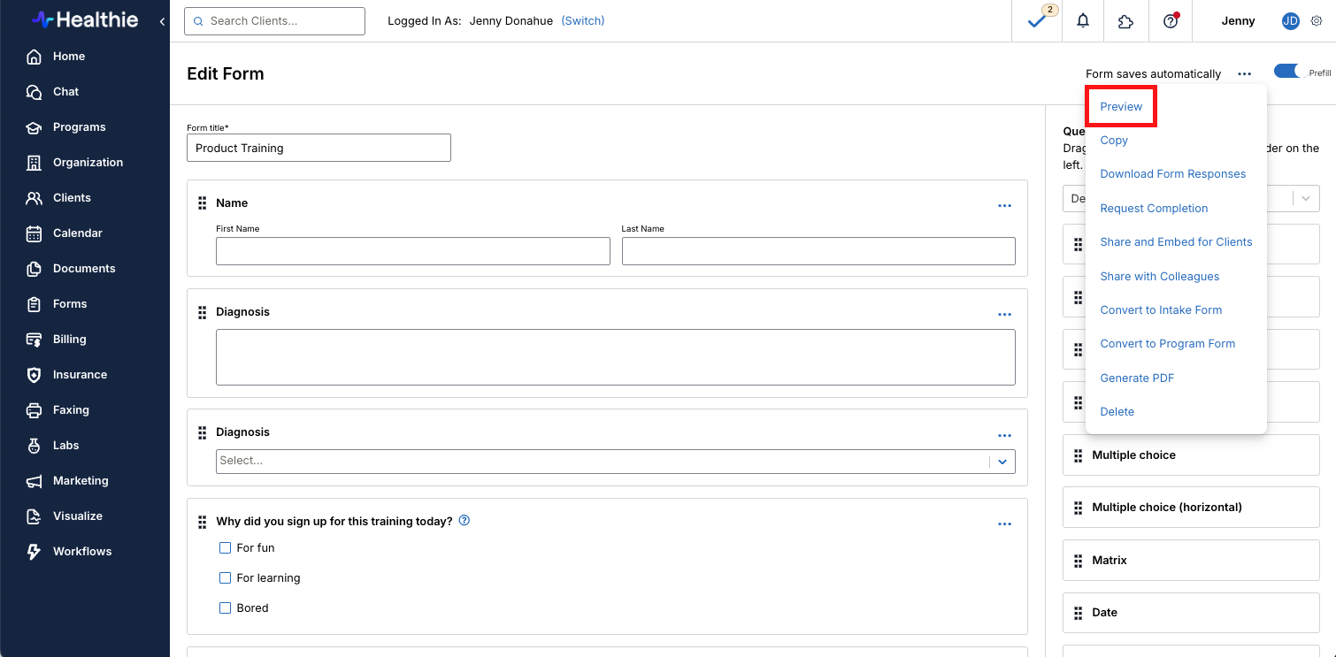 You can also Preview the entire form by going to Options > Preview - this will give you an indication of what clients may see when completing the form.