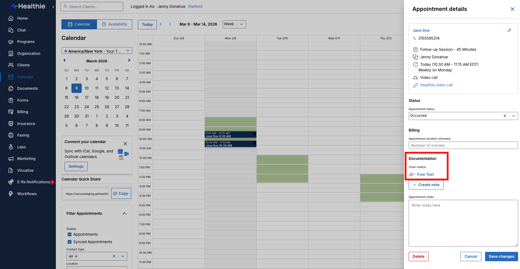 When a session is booked, Healthie automatically detects if a chart note was written that day for that client. If yes, then in the Appointment Details under Documentation there will be a note name that links to the chart note.