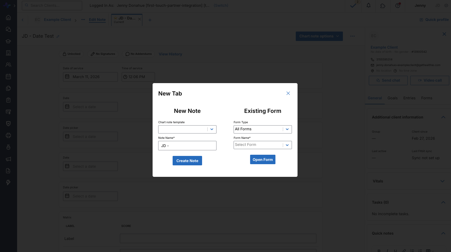 You also have the ability to have multiple charting tabs open simultaneously within the same charting session. This will allow you to toggle between different notes or intake forms (ie. a new chart note and past notes) for more efficient charting and workflows. You can open a new charting tab whether you are currently writing a new note or previewing a note. To open a tab: